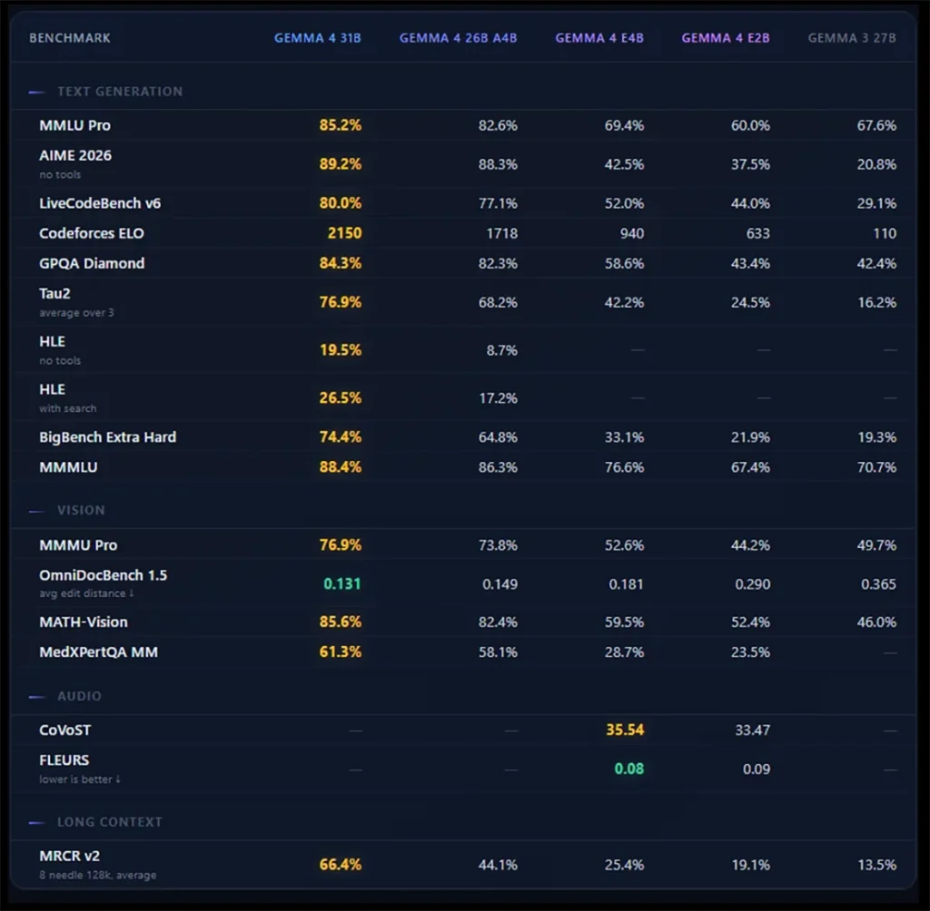 • MATH-Vision : Le modèle 31B Dense atteint 85.6%. Le petit E2B gère 52.4%. Les deux surpassent l’ancien Gemma 3 27B (46.0%).
